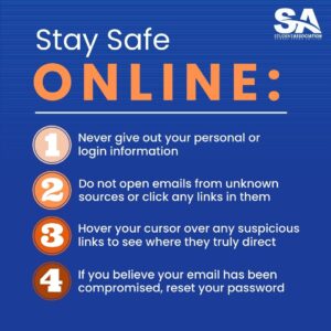 The Student Association encourages staff and students to never give out their personal or login information – especially if you believe the email may be a fake. Those who receive emails from unknown sources should NOT open them, nor should they click on any links.