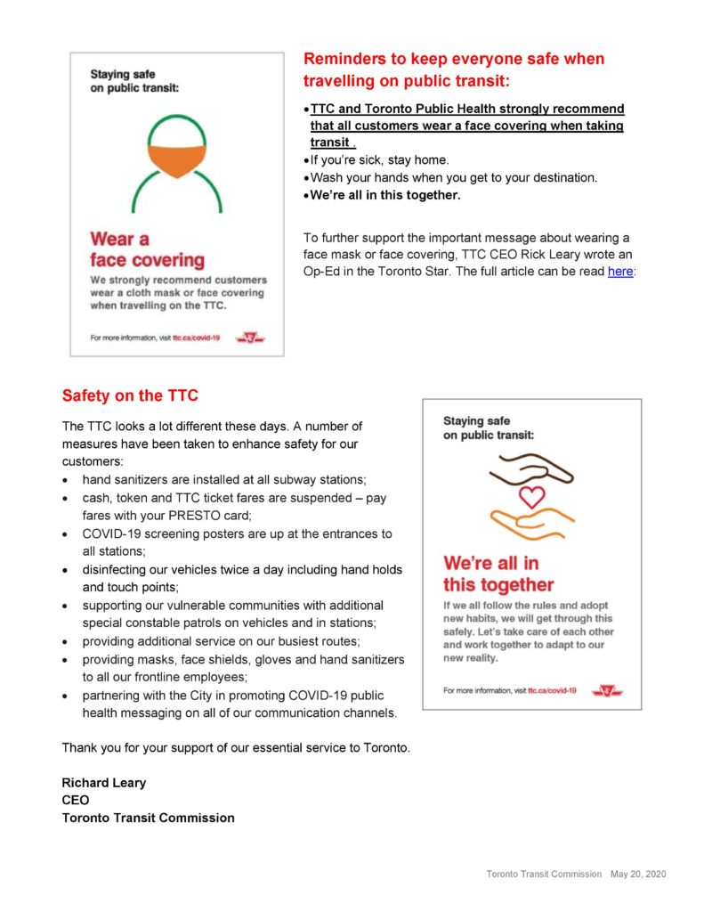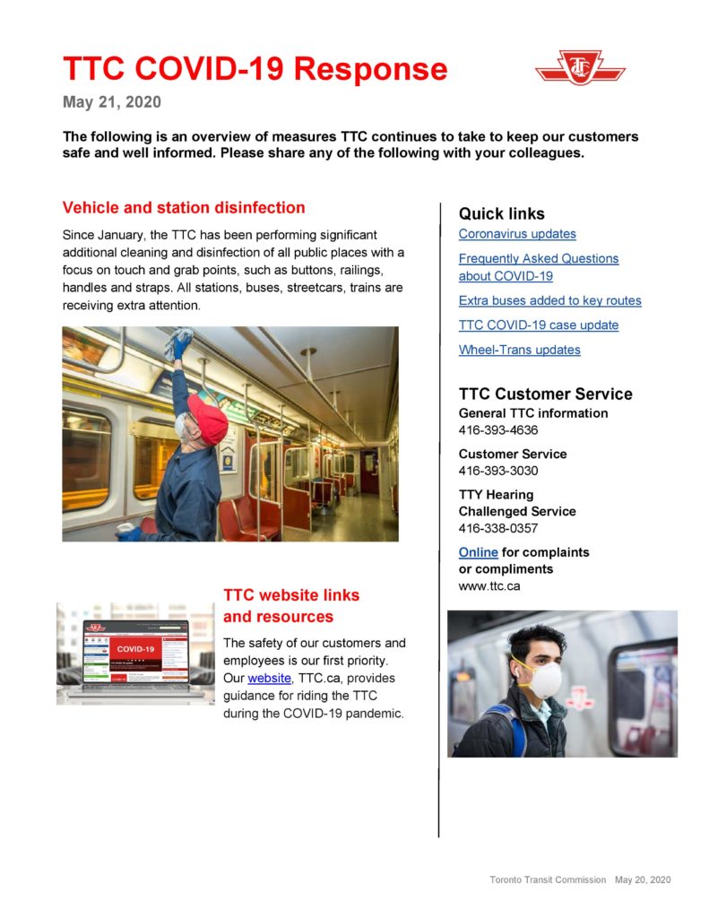 The TTC has issued the following release, highlighting its safety measures and reminding riders of best practices for keeping themselves and other passengers safe.